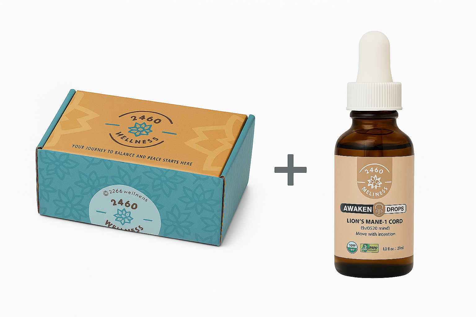 Elevate your wellness with our Deluxe version of the 2460 Holistic Box. This premium set includes all the essentials from our signature box, plus your choice of one powerful mushroom extract tincture- AWAKEN (focus + energy) or UNWIND (calm + stress relief).